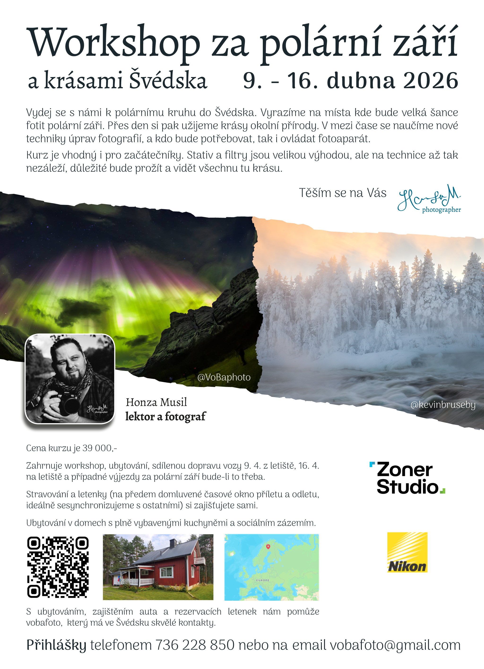 Vydej se s námi k polárnímu kruhu do Švédska. Vyrazíme na místa kde bude velká šance fotit polární záři. Přes den si pak užijeme krásy okolní přírody. V mezi čase se naučíme nové techniky úprav fotografií, a kdo bude potřebovat, tak i ovládat fotoaparát.